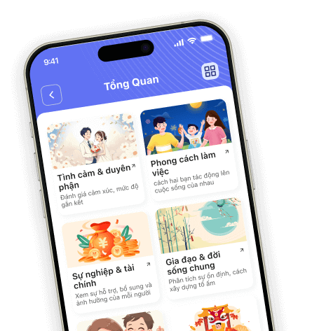 Tính năng này không chỉ xem tuổi hợp - xung đơn thuần, mà còn soi chiếu chi tiết sự hòa hợp giữa hai lá số trên các phương diện: Tình cảm, Gia đạo, Duyên con cái và cả phong cách tài chính khi về chung một nhà, từ đó đưa ra lời khuyên để duy trì hạnh phúc bền vững.